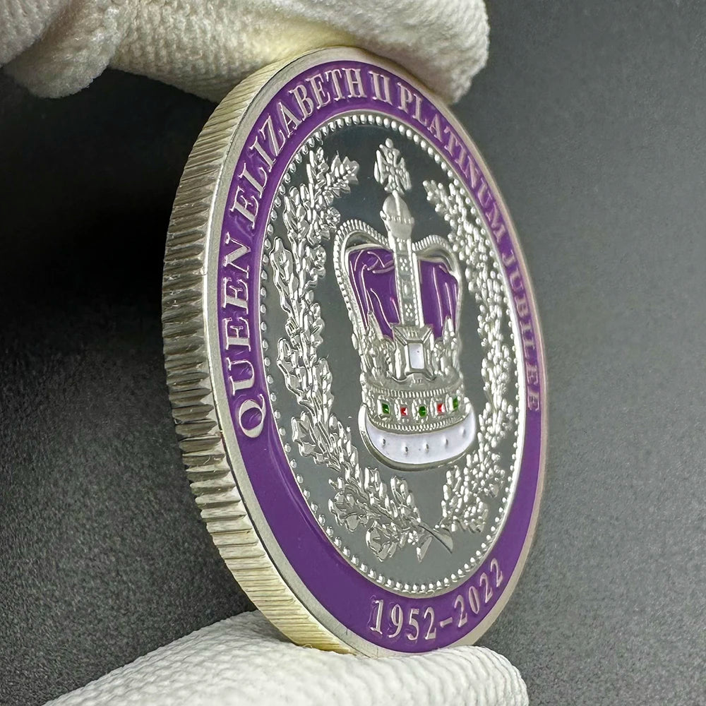 Intricate Design: Detailed engravings of the Queen's crowned cypher, national flower emblems, and the dates '1952-2022'.